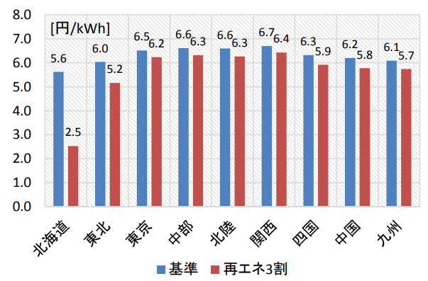 日本のノーダルプライスは、風力導入量の大きい北海道,東北,九州地域では再エネの余剰電力の影響で、ノーダルプライスが相対的に低下傾向となります。特に再エネ3割ケースでは、再エネ導入量の増加に伴う余剰電力の大規模な発生により,電力が供給過剰気味になるため,全国的にノーダルプライスが低下します。北海道や東北においては、特に電力が余るため、ノーダルプライスの低下が著しく地域間の格差が広がっています(図2)。