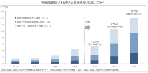 その結果、「新築住宅及び既築住宅向け蓄電システム導入台数を合計すると、2019年実績は年間11万台規模であった市場は、2025年には年間26万台(累積158万台)、2030年には年間35万台(累積314万台)規模に拡大するとの見通しとなった(リプレースは除く)」と言います。(図参照)