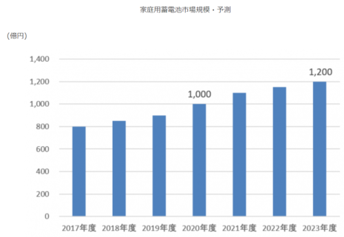 そのような背景から、2019年3月に、株式会社日本能率協会総合研究所が提供するMDB Digital Searchでは日本国内の家庭用蓄電池市場を調査し市場規模を推計し、2023年に1200億円規模になると予測しました。(図参照)