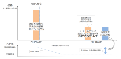 この設定金額は、自家消費により得られる収益で投資回収できる価格水準である『ストレージパリティ』の達成に向けた価格水準ということです。つまり、蓄電池を導入しないよりも、蓄電池を導入したほうが、経済的メリットがある状態といえます。
