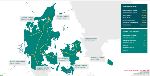 提携しているその周辺諸国の発電量と消費量が24時間リアルタイムで確認できる 出典:ENERGINET